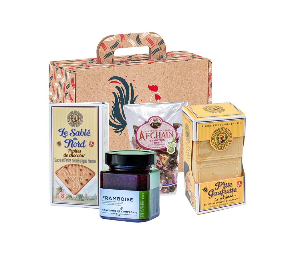 Ce coffret est composé de produits d’épicerie fine artisanale emblématiques de la région Nord : biscuits croquants, confiseries fruitées et confitures gourmandes. Chaque produit a été sélectionné pour sa qualité, sa recette authentique et son goût inimitable.