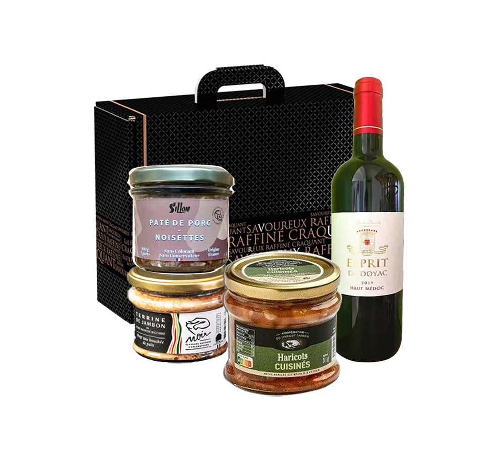 Dans cette composition raffinée, vous retrouverez des produits emblématiques tels que les Haricots Tarbais cuisinés, référence incontournable de la région, une Terrine au Jambon Noir de Bigorre d’une finesse remarquable, ainsi qu’un Pâté de Porc aux Noisettes du Tarn-et-Garonne au caractère rustique. Pour accompagner ces délicieux mets, le Vin Rouge Esprit de Doyac apporte une touche élégante et harmonieuse, parfaite pour sublimer un repas festif.