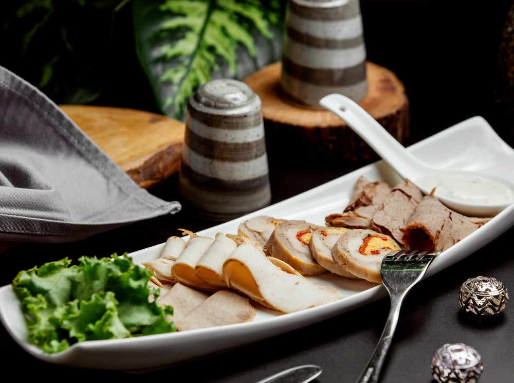 - Vinaigrette miel–vinaigre de vin sur une salade de magret fumé.